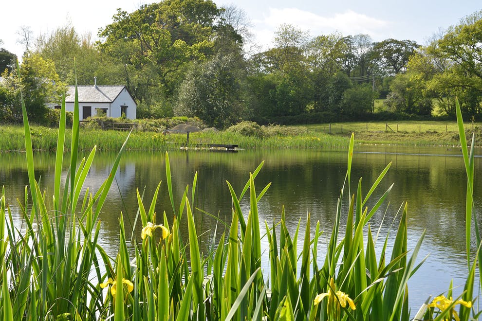 Latchygors Cottage, a peaceful haven for two in a pretty setting overlooking a trout lake, is a dog-friendly cottage set on our secluded 25 acre smallholding near the Pembrokeshire/Carmarthenshire border. 1 mile from the village of Llanfallteg and about ¼ mile from the nearest public road, traffic noise is not a problem here. The path around the lake is perfect for a stroll with the dog, stop a while and watch the wild ducks and geese. Fishing is included in the weekly tariff. The cottage’s central location is ideal for touring the area with its beaches, castles, gardens and Coastal Path, or you can simply relax and enjoy being away from it all. Here, we try to be as eco-friendly as we can. Photovoltaic panels generate electricity, water comes from our own well, heating and hot water from our bio-mass boiler. We produce as much of our own fruit and vegetables as we can (including cider from the apples!) and we have our own beef, lamb and eggs which visitors can purchase according to availability. Latchygors Cottage sleeps 2 in a twin bedroom. All accommodation is on one level. As a converted cowshed, the original beams are exposed, giving the cottage a light and airy feeling.