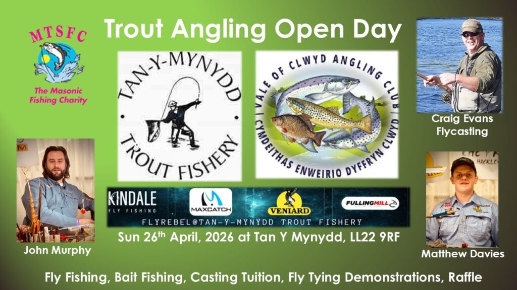 There will be fly casting demonstrations and Q&A sessions with Craig Evans Fly Fishing Instruction, Tan Y Mynydd will promte their wonderful facility. free fishing will be available (just pay for any fish you decide to take home). Vale Of Clwyd Angling Club will be promoting the superb Club that they are and offering new memberships on the Day. The Masonic Fishing Charity will be in attendance to promote the wonderful work they do.