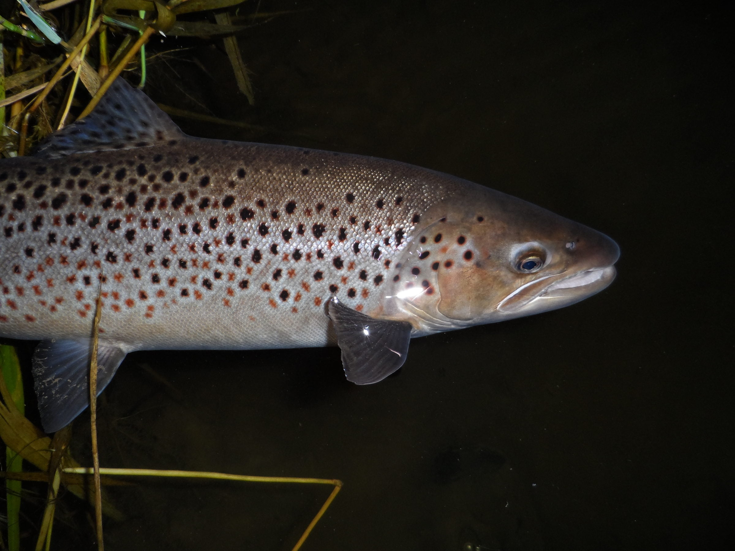 If you have a companion however, he/she can take a photograph while you release the fish. Hold the recovering salmon in the water by the tail and supported under the belly and, when the photographer is ready, lift it a few inches above the surface for a second to get the shot. In the case of a sewin caught in darkness, there are additional photographic problems but it is still possible to get a shot, sometimes a good one, as you release the fish from the net. (Note that you can also hold a big trout by the tail for a moment, although not as securely as with a salmon). Have your camera on the correct setting and work out in advance what you are going to do with the head torch. If you are illuminating the fish with white light, you will want to shield the rest of the pool as you do so and you may sacrifice your night vision for a while. Again, please don’t take your fish out of the water.