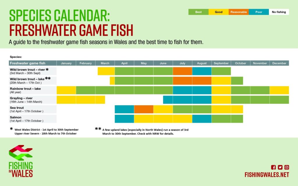Please note: Game fishing seasons in Wales may be subject to local variation. Click here for full regional details.